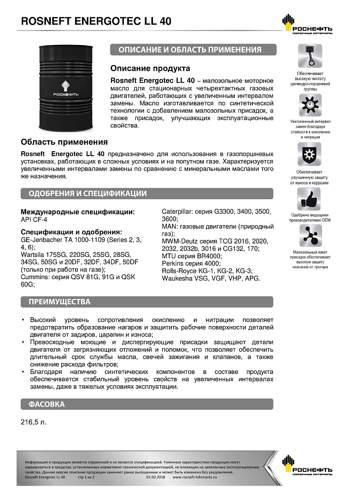 Rosneft Energotec LL 40 создано для применения в газопоршневых установках, эксплуатирующихся в сложных условиях и на попутном газе. Характеризуется повышенными интервалами замены по сравнению с минеральными маслами того же назначения.