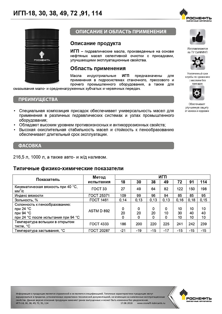 Преимущества: За счет правильно подобранной композиции высокоэффективных присадок масло гарантирует повышенную надежность работы оборудования и его производительность; Срок службы масла увеличен в 2-4 раза по сравнению с маслами без присадок, что значительно устраняет простои оборудования и трудозатраты на его обслуживание; Универсальность использования в самых различных системах и узлах производственного оборудования благодаря присадкам с определенным комплексом свойств.