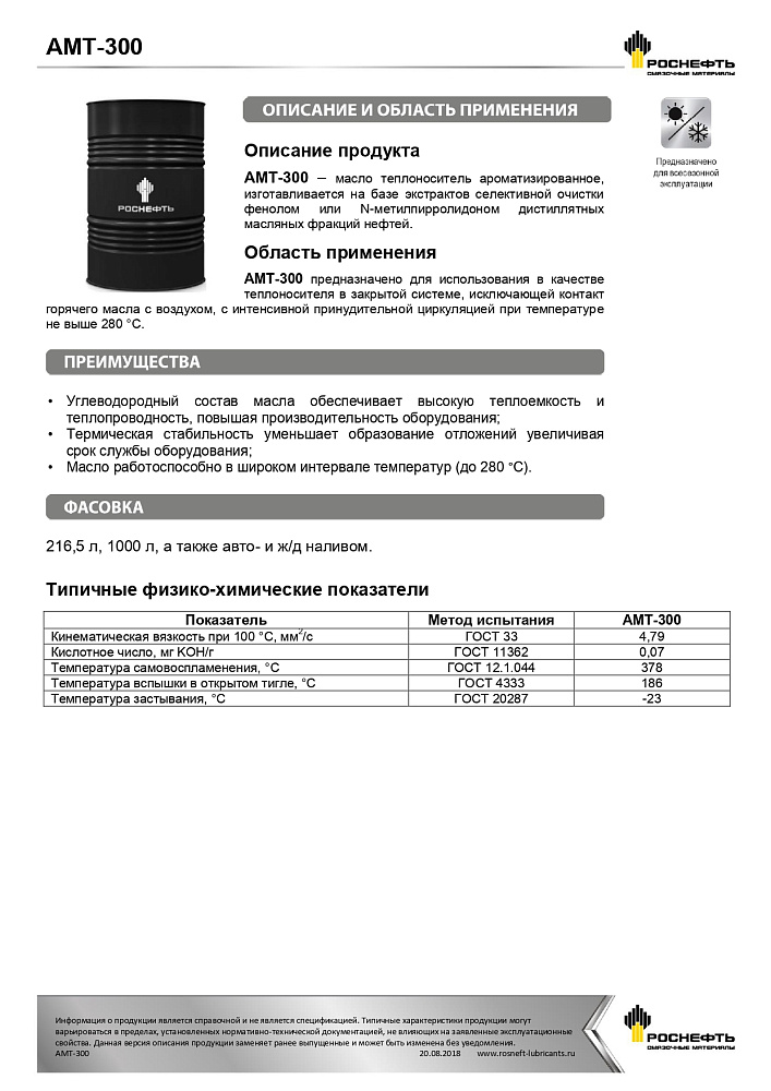 Масло АМТ-300 используют как теплоноситель в закрытых системах, исключающих контакт горячего масла с воздухом, а также снабженных интенсивной принудительной циркуляцией при температуре не выше 280 °С. При использовании масла АМТ-300 необходимо соблюдать меры пожарной безопасности: установки и системы высокотемпературного обогрева маслом и помещения, в которых они размещены, должны быть выполнены в соответствии с ПЭУ-76.