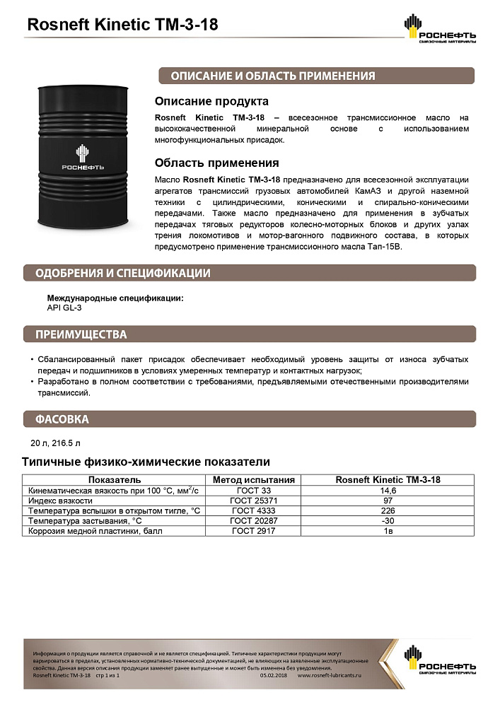 Область применения: Масло Rosneft Kinetic ТМ-3-18 разработано для всесезонной эксплуатации агрегатов трансмиссий грузовых автомобилей КамАЗ и другой наземной техники с цилиндрическими, коническими и спирально-коническими передачами. Также масло используют в зубчатых передачах тяговых редукторов колесно-моторных блоков и других узлах трения локомотивов и мотор-вагонного подвижного состава, в которых предусматривается применение трансмиссионного масла Тап-15В.