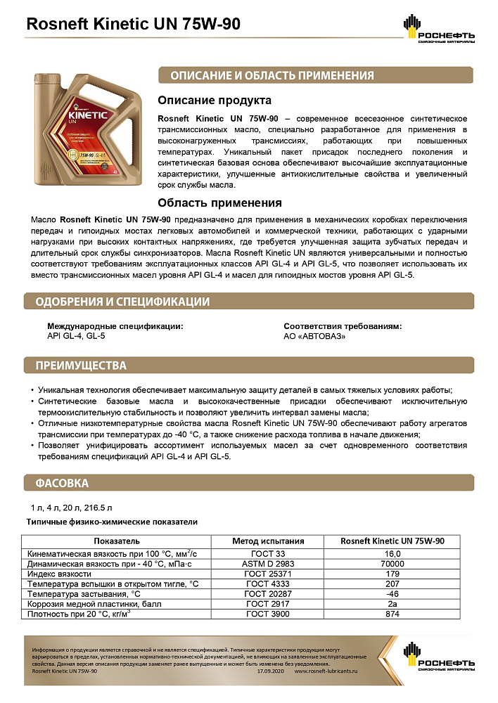Масло Rosneft Kinetic UN 75W-90 разработано для использования в механических КПП и гипоидных мостах легковых автомобилей и коммерческой техники, работающих с ударными нагрузками при высоких контактных напряжениях, где необходима улучшенная защита зубчатых передач и длительный срок службы синхронизаторов. Масла Rosneft Kinetic UN являются универсальными и полностью соответствуют всем необходимым условиям эксплуатационных классов API GL-4 и API GL-5, что позволяет применять их вместо трансмиссионных масел уровня API GL-4 и масел для гипоидных мостов уровня API GL-5.